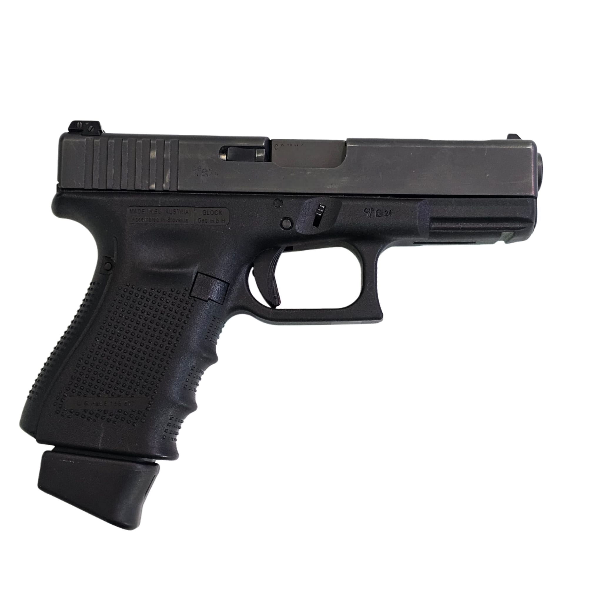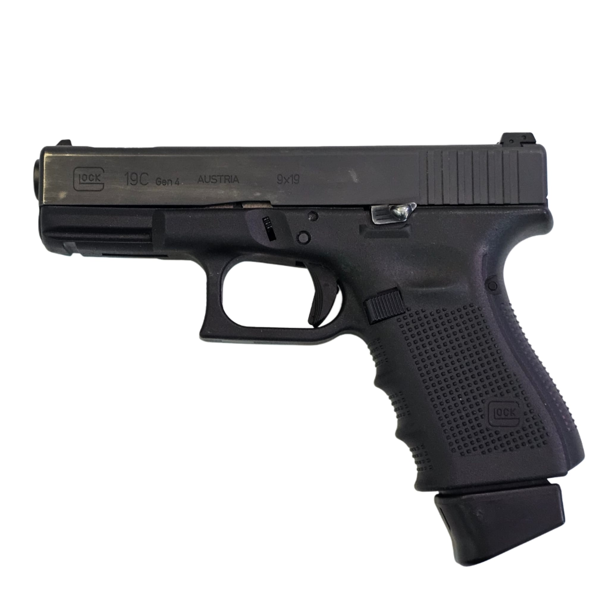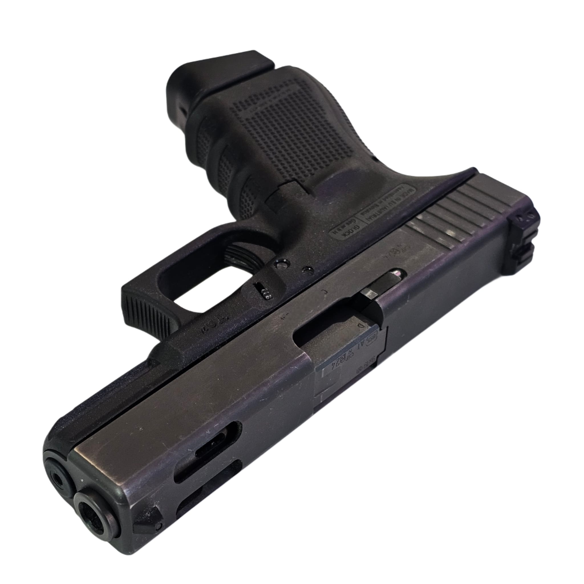 קומפקטי עם מפצה סטייה אינטגרלי | מצב: יד 2 דגם ה-"C" (Compensated) של גלוק 19 מציע חריצים ייעודיים בקנה ובצינה המשחררים גזים כלפי מעלה בעת הירי.
