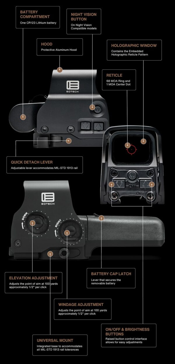 ה-EXPS3 מציעה חווית ירי איכותית עם שתי עיניים פתוחות לרכישת תמונת מטרה מהירה, כוללת הגדרות תואמות לראיית לילה, ובסיס ניתוק מהיר מוגבה ב-7 מ"מ כך שניתן להשתמש גם בכוונות הברזל במידת הצורך, הכוונת מתאימה לכל מסילה פיקטינית סטנדרטית (20 מ"מ)